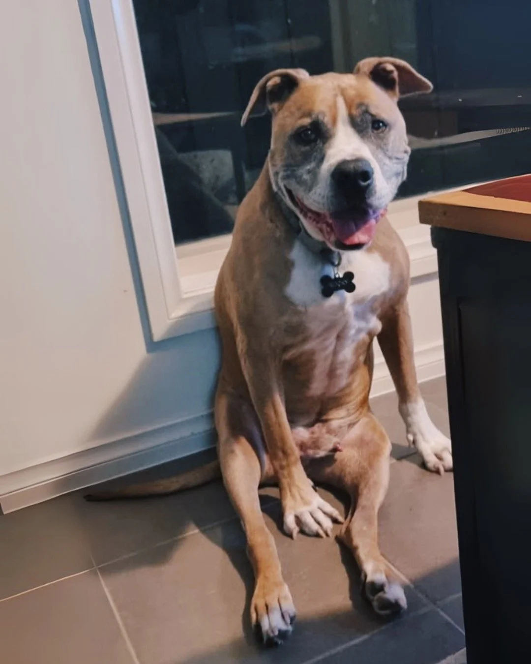Pictured: Rocky, ‘spinal sitting’, note the way he is sitting, tenseness in his face, and the muscle loss.